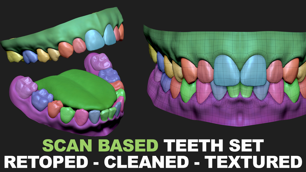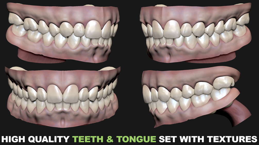 My High-Resolution Teeth and Tongue Set, based on dental scan data of my own teeth. Cleaned, topologized, UV'd, textured (and my snaggletooth corrected.) Perfect for rendering, animation and games.